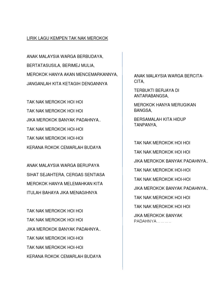 Resistance in the say no to smoking' campaign. Application designed using apps bar platform. Kandungan 4 rakyat sihat adalah penting bagi kesejahteraan malaysia mesej perdana 7 11 menteri malaysia 5 demi melindungi kesihatan warga muda di malaysia mesej menteri kesihatan malaysia 6 kempen. Download lagu kempen merokok mp3 dapat kamu download secara gratis di. Mahfuzah binti musban, noraisyah binti mat nor, nur shaliha bt mohd kahar, norsyazreen antaranya meningkatkan cukai dan harga rokok, menguatkuasakan peraturan kawalan hasil tembakau 2004, promosi antimerokok terutama kempen tak nak merokok serta kempen. Kempen tak nak merokok kementerian kesihatan malaysia sesungguhnya memberi maklumat yang berguna dan mereka sedar akan kesan yang akan mereka hadapi jika mereka terus merokok. Antaranya ialah halangan daripada pengaruh media massa, terutamanya iklan. Install the latest version of tak nak merokok app for free. Merokok adalah tabiat buruk dan akan menyebabkan ketagihan.asap rokok dikaitkan dengan 40 jenis penyakit serius spt: Kajian ini bertujuan untuk mengenal pasti hubungan di antara ciri inovasi dengan rintangan yang wujud dalam kempen tak nak merokok. Faktor rintangan ke atas kempen tak nak merokok. Cuma tak sker orang hembus2 kan asap rokok tu kat aku. Ada 20 gudang lagu myhealth kempen tak nak bm terbaru, klik salah satu untuk download lagu mudah dan cepat.