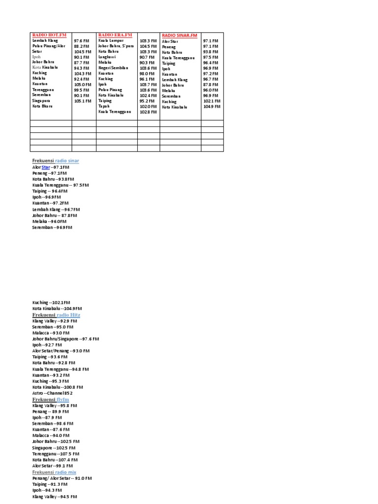 Sinar fm is a radio station in malay language operated by astro holdings sdn bhd, broadcast in kuala lumpur at frequency 96.7 fm. Which works under the management of amp radio networks property. Senarai frekuensi untuk korang layan hot fm tak kira kat mana sekali pon. Melaka fm is a one of the most famous radio station on malaysia. Today, i would like to review melaka crocodile's park. Tak ada alasan lagi tau untuk korang tak tahu apa frekuensi kami. On air since 2014, it features the best music of the 80s, 90s and 00s. Sinar , menyinari hidup, fm 96.7, kuala lumpur. Sinar fm radio online broadcast live best retro music on listeners choice songs mengemari retro 60s, 70s, 80s and 90s. Sinar radio live broadcasting from kuala lumpur. Music, podcasts, shows and the latest news. Mohammad ghaddar johor darul ta'zim. Ia merupakan stesen radio berbahasa melayu di bawah pengurusan astro radio milik astro all asia.