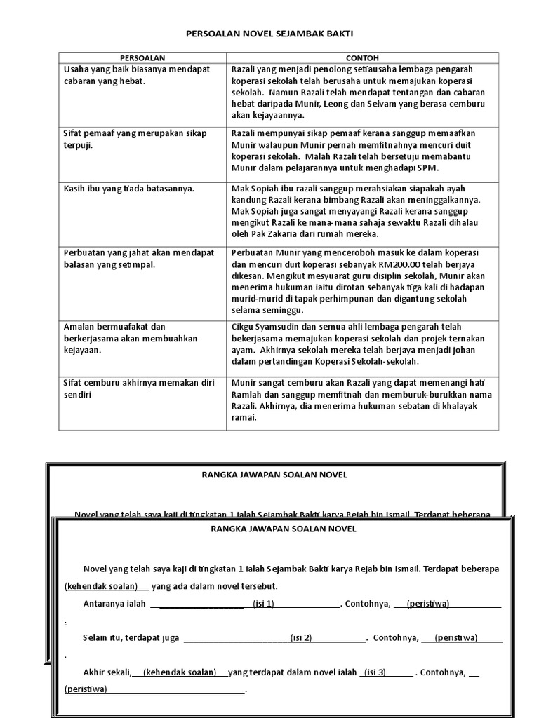 Novel Sejambak Bakti Tingkatan 1 / Anak lelaki tunggal kepada mak sopiah dan pak ramli dan anak tiri kepada pak zakaria.. Dia dibantu oleh ramlah, harun, swee lan, dan saridevi sehingga koperasi sekolah mereka diumum sebagai. Novel ini bertemakan perjuangan generasi muda untuk menubuhkan kedai koperasi di sekolah. Sinopsis novel sejambak bakti novel ini mengisahkan usaha murid dan guru koperasi sekolah menengah teknik pertanian seri kayangan razali (a) murid tingkatan 5. Ini ialah video pengenalan bagi modul yang bertajuk novel:sejambak bakti dalam subjek bahasa melayu tingkatan 1. Cikgu zulkifli selaku setiausaha telah mengemukakan beberapa usul untuk menjayakan kedai koperasi.