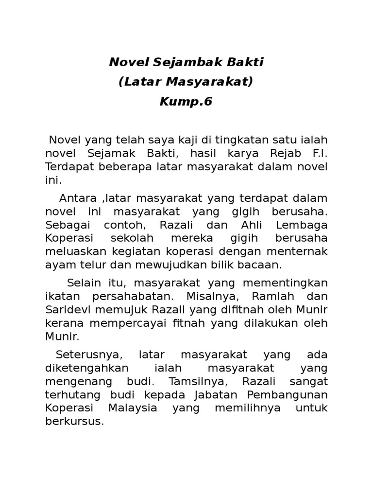 Tahun ni saya pt3,nak buat revision dari tingkatan 1. Novel tingkatan 1 sejambak bakti kupasan novel laman komsas antologi dan novel terkini. Novel ini bertemakan perjuangan generasi muda untuk menubuhkan kedai koperasi di sekolah. Text of novel sejambak bakti. Usj komsas antologi kuingin berterima kasih novel sejambak bakti tingkatan 1 oxford fajar resources for schools higher education.